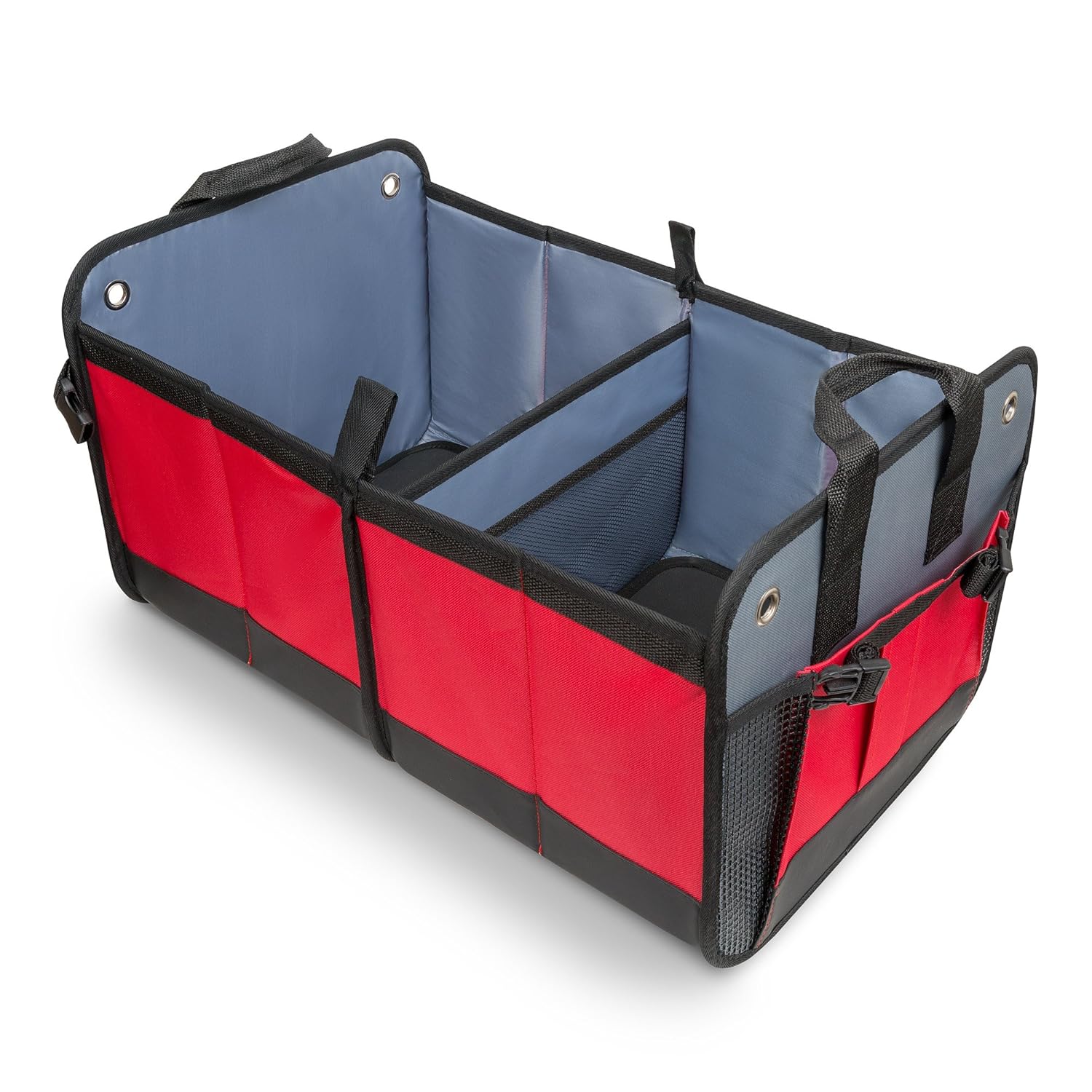The car trunk organizer provides the storage and organizer solution that you are looking for. It is big enough for keeping a wide variety of items in one place such as tools, sports and camping gear and even grocery items. It has a rigid side and base plates that stay upright even when empty. It is lightweight and easy to carry which makes it ideal for camping, picnics and road trips. It also has heavy duty side buckles for easy folding and storage.